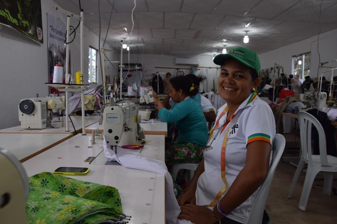 The atmosphere where the women sit, is different and not only because of the cool air generated by two air conditioners or the gigantic ceiba tree which provides the factory shade from the strong rays of the sun. It is because here, former combatants, their families and community members work together to manufacture goods that promise a new way of life.