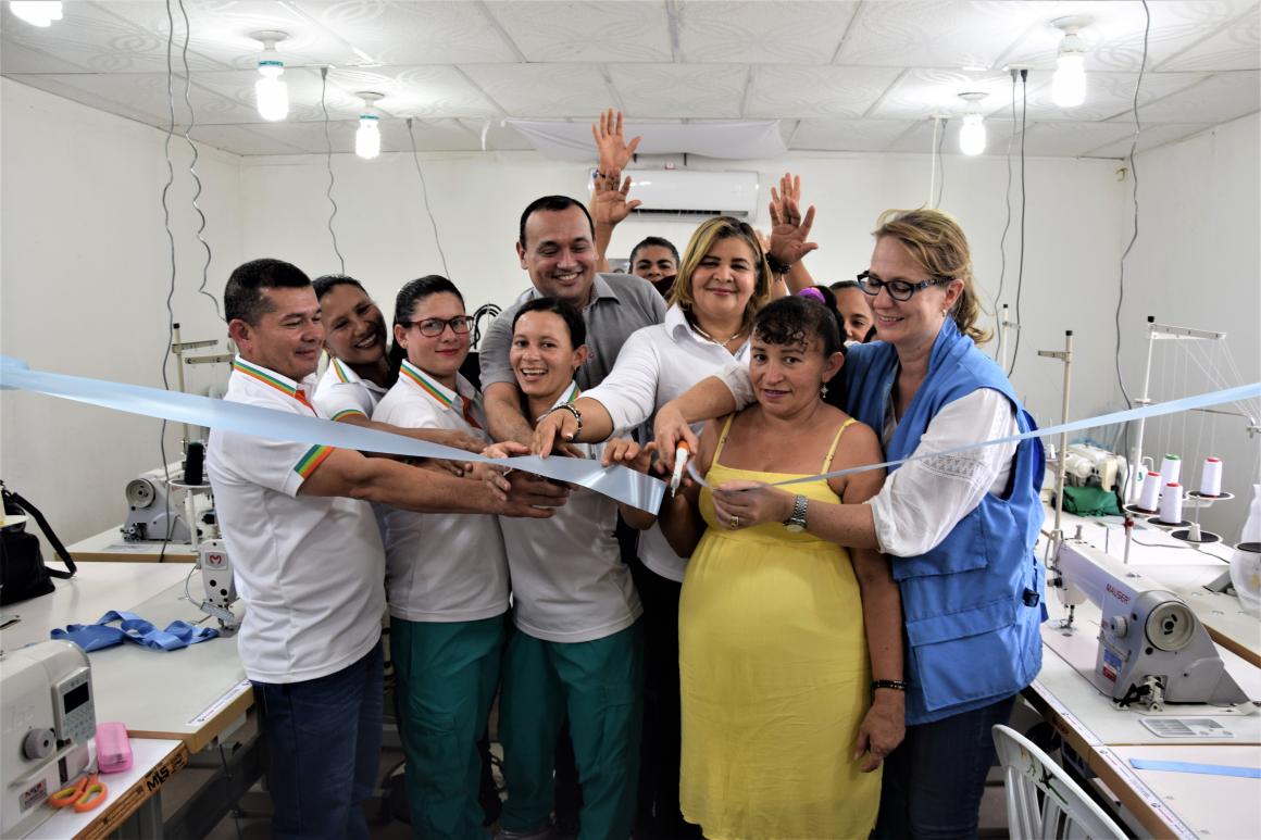 The clothing workshop was established in the former food warehouse of the TATR by the former combatants with the help of the National Training Service (SENA by its Spanish acronym). They painted the facade, borrowed two air conditioners, and two months later SENA lent them 33 sewing machines and brought in a teacher for a course in dressmaking. Former combatants and community members were invited to attend the training. Thirty-five women came, 15 will graduate. Eight are former combatants, four their relatives and three are women from the nearby community.