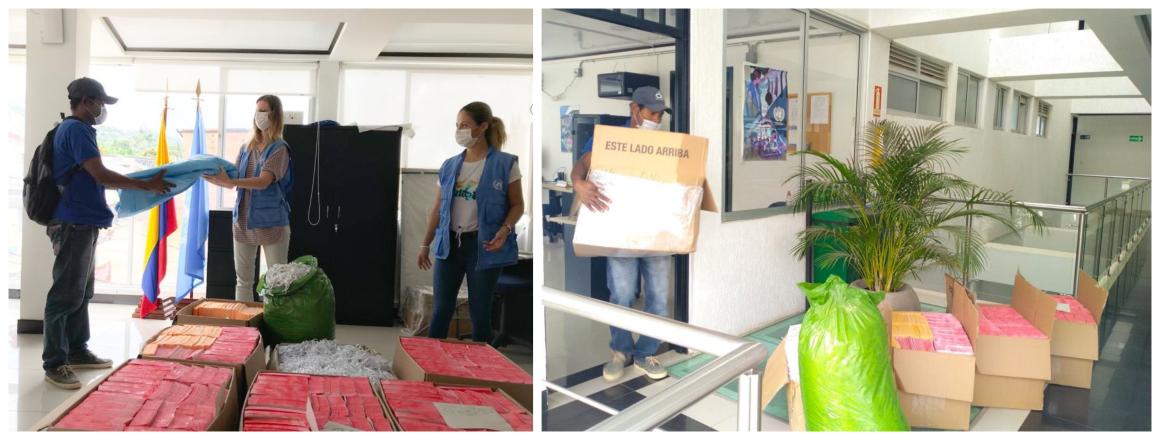With donations received since March, Icononzo has already produced thousands of units that have donated as follows: 1,000 face masks for the geriatric home, in the urban area. Thousand for the 'La Picota' prison population in Bogotá. Another 1,000 for indigenous communities in the Las Hermosas canyon in southern Tolima, and 4,000 for a hospital in Neiva, Huila. They will now manufacture 16,800 units with the inputs received from the UN Verification Mission.