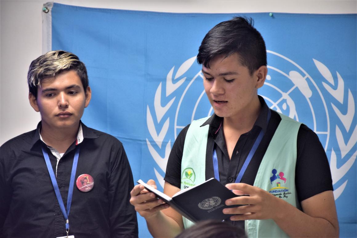 “I am Obet David Aguirre, and I want to tell you a story. A year ago, I received a call from my parents inviting me to go to Cesar, I didn’t know where I was going to, and when I arrived, I was surprised to find out they belonged to the FARC. I was coming for 15 days, but I decided to stay to support peace”. Obet told to the audience that he has felt discriminated for having ex-combatant parents and for living in the former Territorial Area for Training and Reintegration (TART) of Tierra Grata, in Manaure, Cesar, and he also affirmed that this situation has encouraged him to work on the 'Sounds of Peace' project.