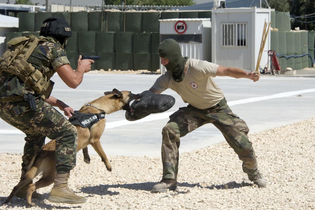 A Lebanese Special Forces soldier (left) and his combat dog apprehend an “aggressor” during attack dog training.