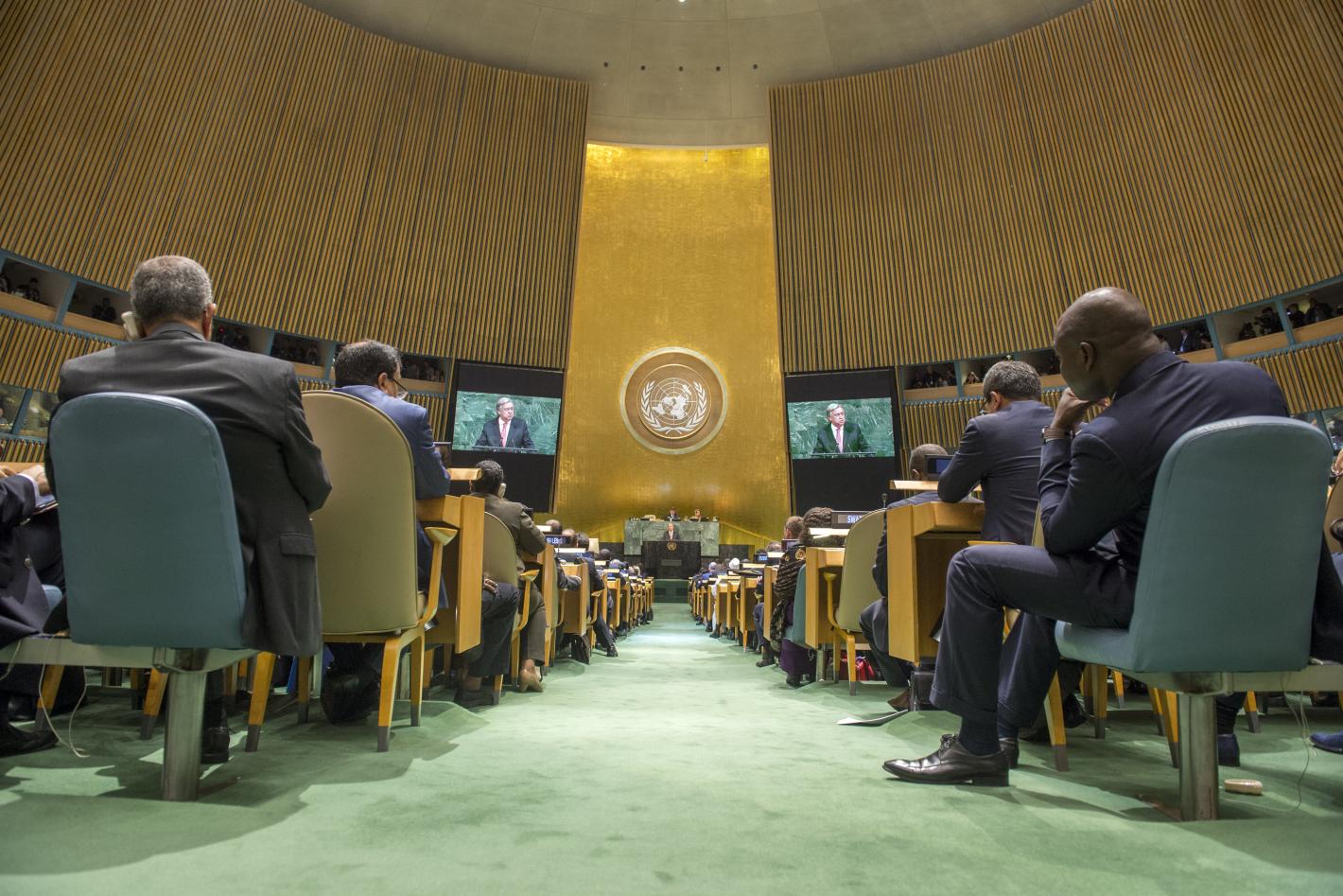 Secretary-General António Guterres (shown on screens) presents his annual report on the work of the Organization at the opening of the General Assembly’s seventy-second general debate. UN Photo/Cia Pak