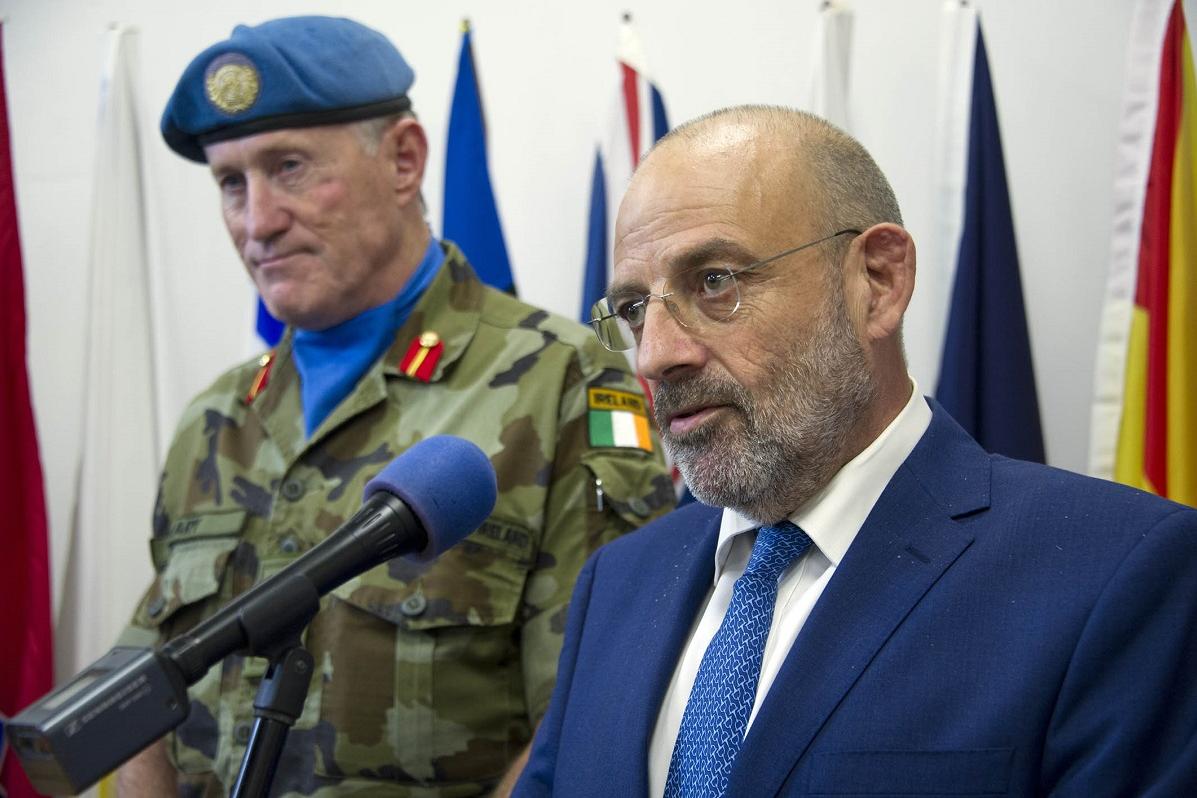 Lebanese Minister of Defense Yaacoub Sarraf addresses UNIFIL and LAF officials at UNIFIL headquarters after his meeting with UNIFIL Commander Major General Beary.