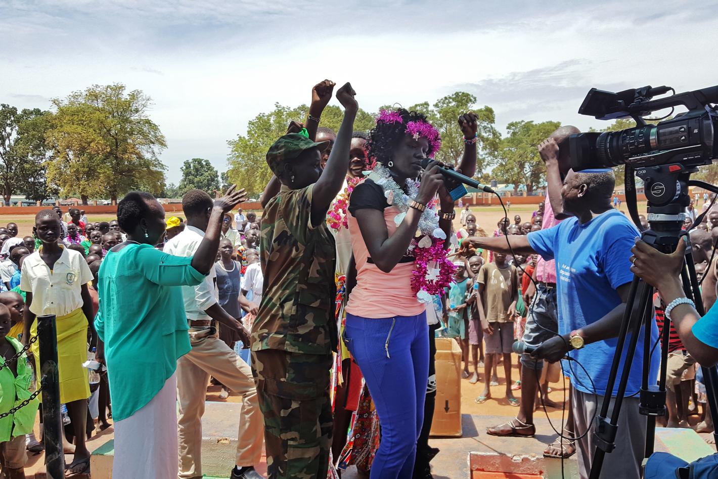 Akuruel Makuei Maiwer, local artist, gives an impassioned peformance before the crowd at the 'Women for Peace Concert' on Monday, 4 September 2017 in Rumbek, South Sudan. The event, organized by the United Nations Mission in South Sudan, aimed to empower women through music and drama. UNMISS /Muna Tesfai