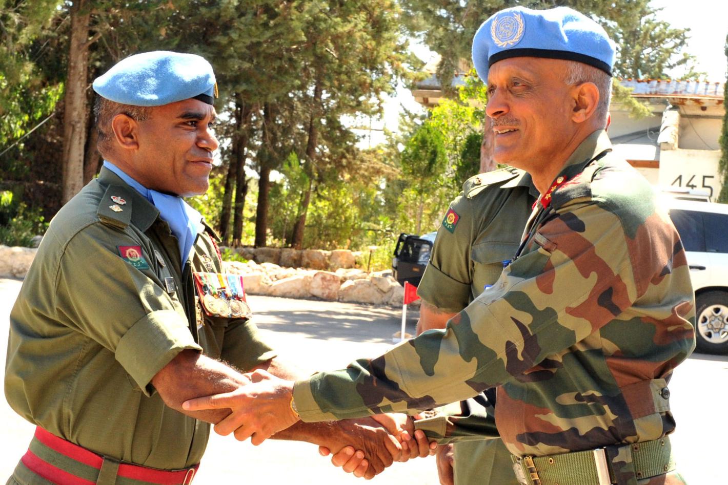 Commanding Officer Fiji Batt Lt Col Ravunakana welcoming the Force Commander and Head of Mission (Chief Guest) Maj Gen Jai Shanker Menon at the Fiji Batt Medal Parade in Camp Fauoar.