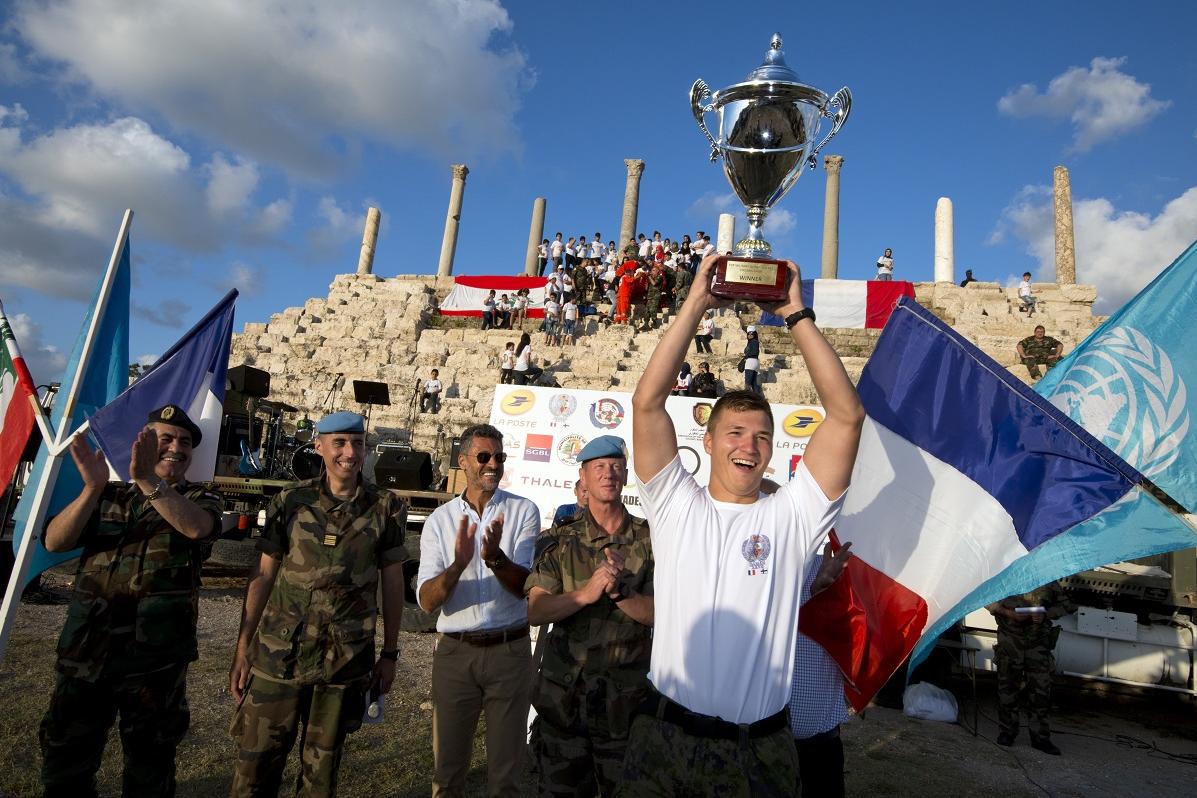 UNIFIL’s Force Commander Reserve (FCR) team captain raises the Military Olympiad Cup - 2017.
