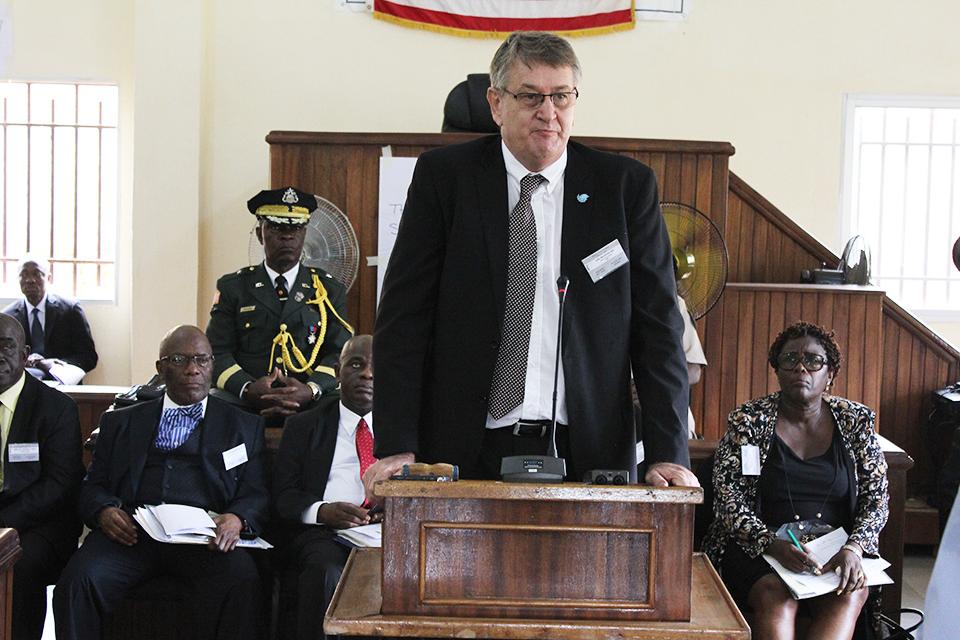 UNMIL’s DSRSG for Political and Rule of Law, Mr. Waldemar Vrey addresses the Judicial Retreat in Gbarnga, Bong County.