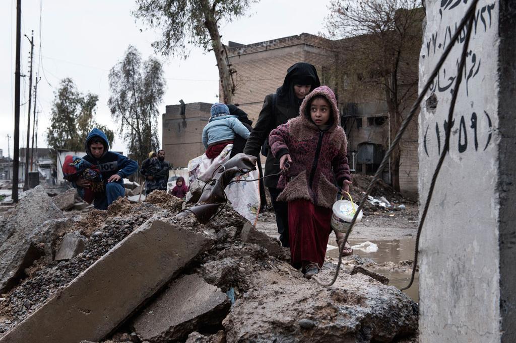 A family displaced by fighting between ISIS and Iraqi security forces carry their belongings as they walk through the destroyed western neighbourhood of Al Mamum, near Mosul, Iraq. Photo: UNICEF/Alessio Romenzi