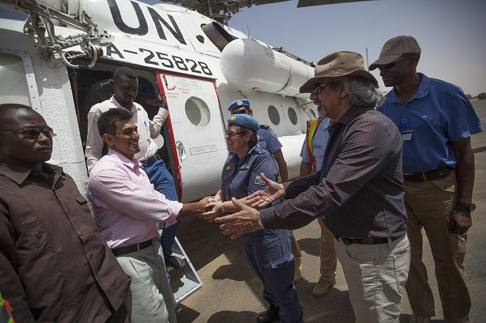 Mr. Irfan Jaffery is welcomed by the UNAMID police commissioner, Ms. Hester Paneras, and some other Mission's senior staff members at El Fasher airport. Photo by Albert González Farran El Fasher, 13 June 2014 – An…