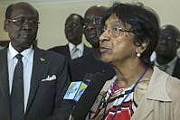 UN High Commissioner for Human Rights Navi Pillay with UN special envoy for the prevention of genocide Adama Dieng and South Sudanese Minister of Foreign Affairs Barnaba Marial Benjamin after meeting to discuss human rights…