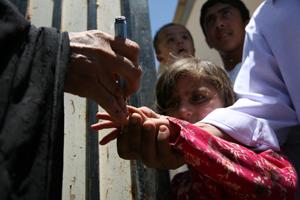 9 June 2010 - Mohammed Azeem opens the iron gate to the compound where his family lives in the second district of Farah city. Outside, two female volunteers for the polio immunization campaign ask the 15-year-old boy about…