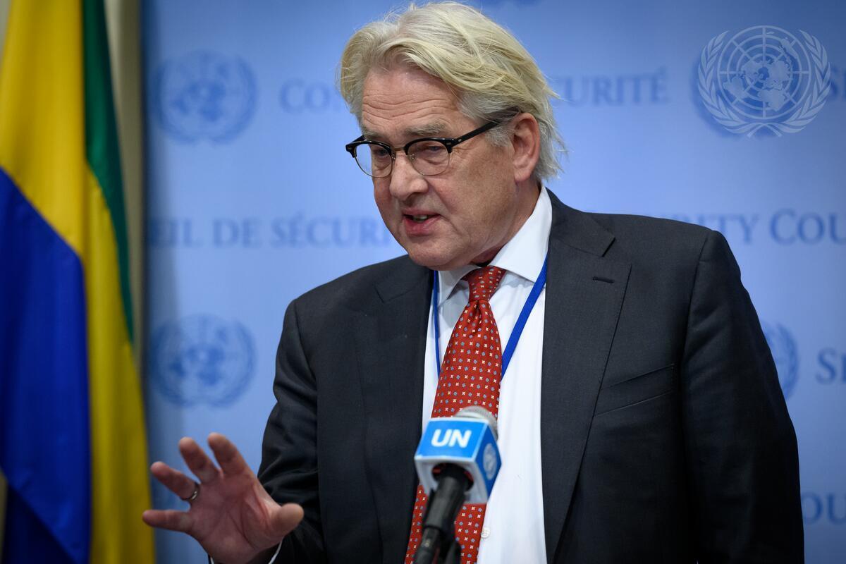 Tor Wennesland, Special Coordinator for the Middle East Peace Process, briefs reporters after the Security Council meeting on the situation in the Middle East, including the Palestinian question. (UN Photo/Loey Felipe - 28 November 2022)