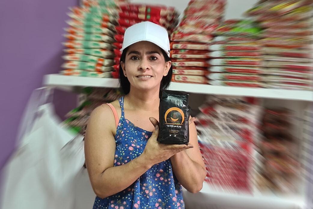 Cristina holds a bag of coffee produced by former Farc combatants in Cauca. Photo by: Elizabeth Yarce/UNVMC