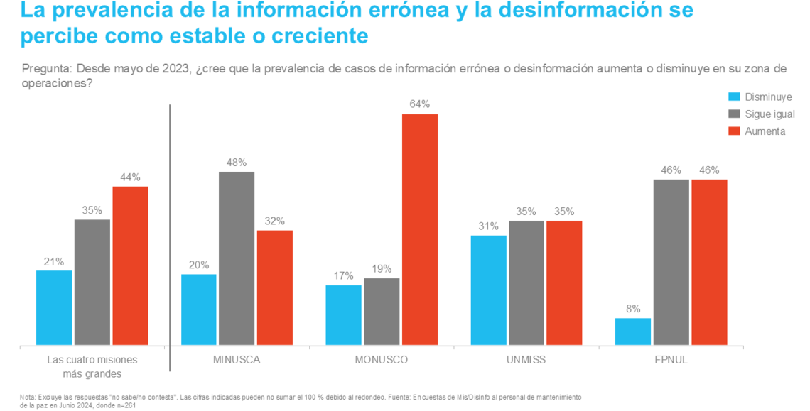 En 2024, una encuesta interna al personal de mantenimiento de la paz reveló que la información perjudicial sigue siendo una amenaza importante para las operaciones de paz. Casi todas las misiones percibieron que la cantidad de información errónea o desinformación iba en aumento en sus zonas de operaciones. Cuando se les preguntó por la propagación de información errónea y desinformación, el 44 % del personal encuestado de las cuatro misiones más grandes observó un aumento de la prevalencia de información errónea o desinformación.