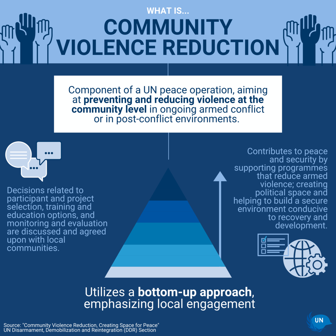 En las situaciones en que es demasiado pronto o no es posible llevar a cabo programas de desarme, desmovilización e integración, las Naciones Unidas prestan apoyo a los programas de reducción de la violencia comunitaria que generan las condiciones adecuadas para que los procesos políticos progresen y los grupos armados se disuelvan. Estos se pueden desarrollar también al mismo tiempo que los programas de DDR, de manera que los complementan y abordan las necesidades de las comunidades y, al mismo tiempo, las de los combatientes.