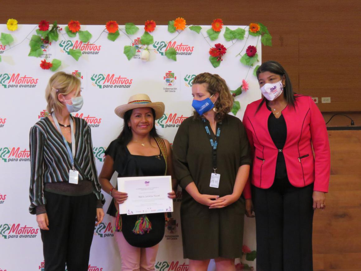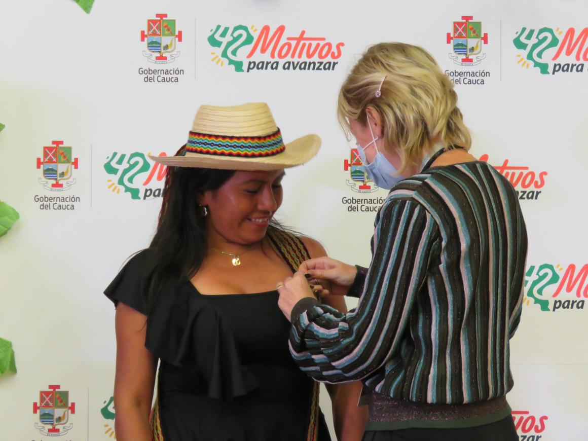 El 8 de marzo, en el día de la conmemoración del Día Internacional de la Mujer, en Popayán (Cauca), tuvo lugar una gala para mujeres destacadas, en sus roles de liderazgo y en defensa de la vida, al estar en primera línea de respuesta a la crisis de la Covid-19. En la velada fueron condecoradas trabajadoras de la salud, las ocho alcaldesas del departamento del Cauca, así como mujeres militares, policías y lideresas comunitarias e indígenas. Entre ellas estaba María Lucrecia Viscue, una mujer en proceso de reincorporación que lidera el proyecto Hilando Paz, de artesanías tradicionales con fique y cabuya, en el antiguo Espacio Territorial de Capacitación y Reincorporación (ETCR) de Santa Rosa/Los Monos, en Caldono, Cauca.