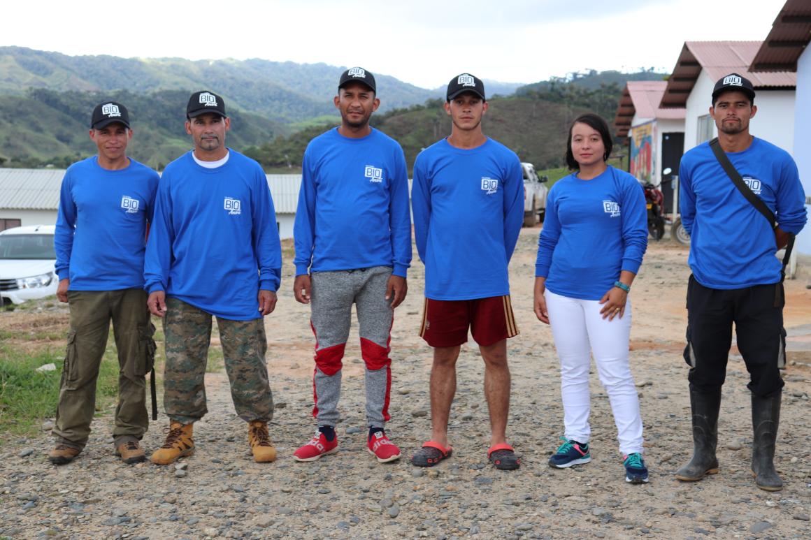 Seis de los excombatientes de Farc que participan en Bio Anorí como auxiliares de investigación, guías y coinvestigadores. Foto: Elizabeth Yarce