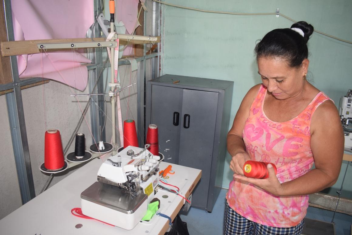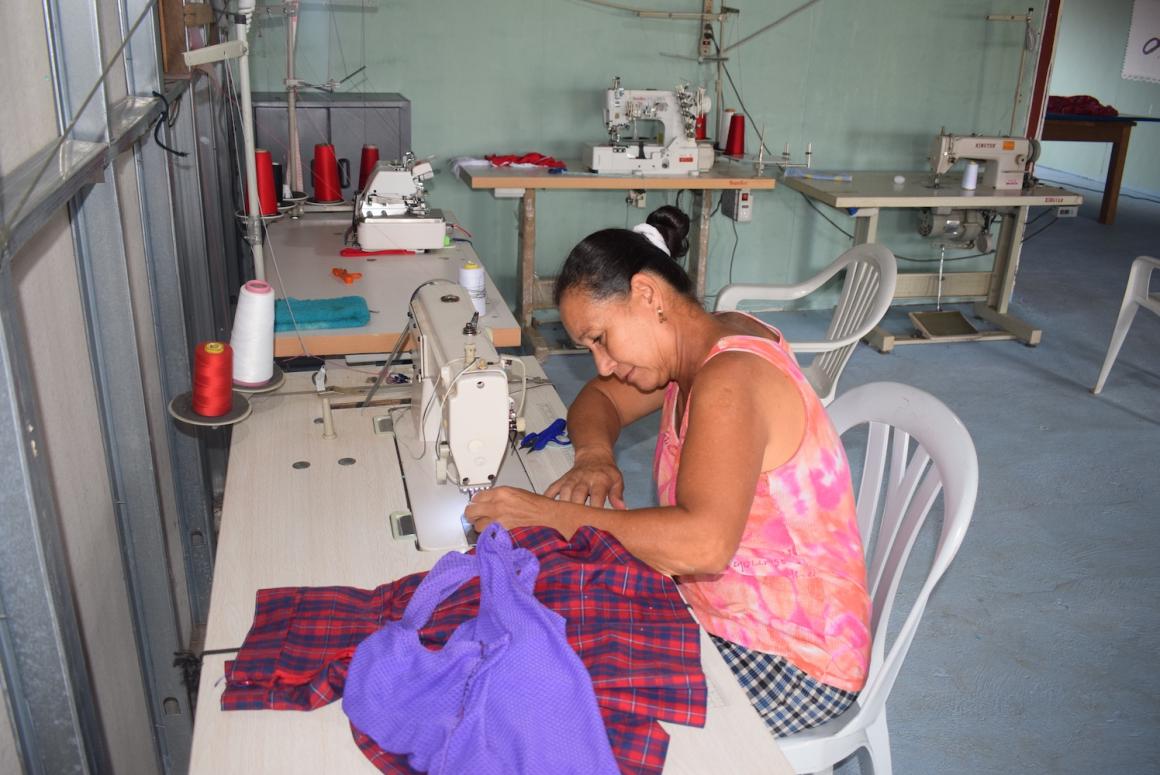 Para ocupar su tiempo en el ETCR, doña Teresa comenzó a coser en unas máquinas que los excombatientes usaban para confeccionar sus uniformes y ropa. “Aquí había unas máquinas que ellos las tenían de antes, unas dos agujas y otra fileteadora, eran con las que ellos hacían sus cosas. Pero también hay otras nuevas que trajimos de Medellín, yo les ayudé a buscarlas”, cuenta Teresa.