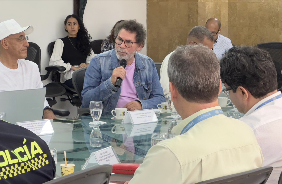 Enrique Sánchez, jefe de la oficina regional en Medellín de la Misión de Verificación de la ONU en Colombia, junto al oficial de enlace Rodolfo Zapata y delegados de MAPP OEA, fuerza pública y otras entidades del Consejo Departamental de Reincorporación.