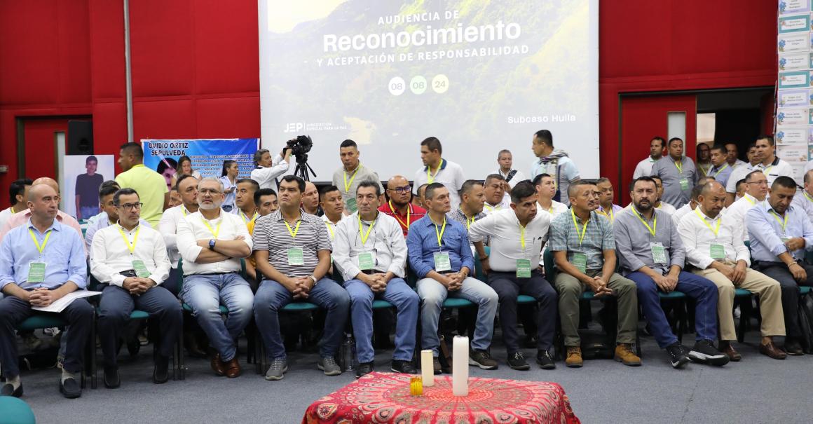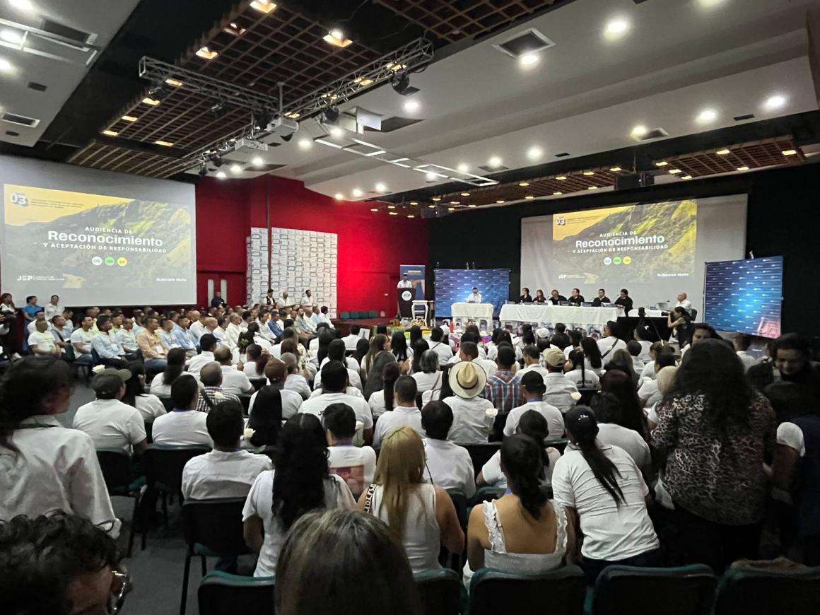 Del 8 al 10 de agosto, familiares de 170 víctimas y 74 comparecientes de Fuerza Pública, incluidos 28 máximos responsables, participaron en Neiva, Huila, de la Audiencia de Reconocimiento y Aceptación de Responsabilidad, en el marco del caso 03, sobre “Asesinatos y desapariciones forzadas presentadas como bajas en combate por agentes del Estado” de la Jurisdicción Especial para la Paz (JEP).