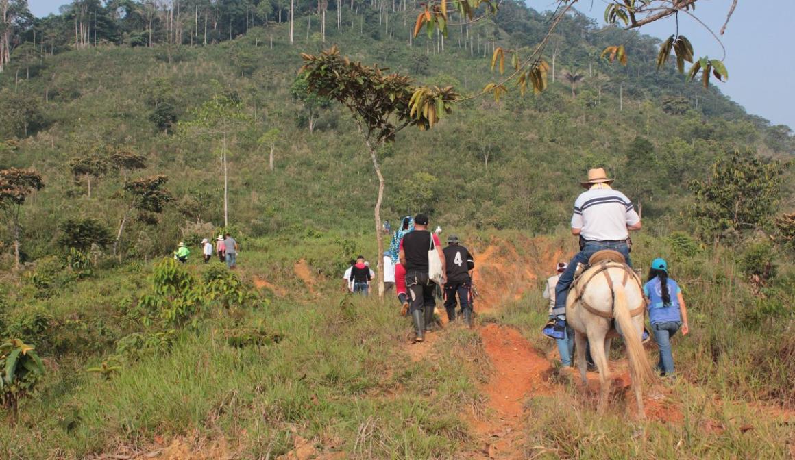 Turistas recorriendo la vereda Manaure, Balcón de Cesar, con excombatientes de Farc, de Tierra Grata Ecotours, quienes trabajan como guías turísticos.