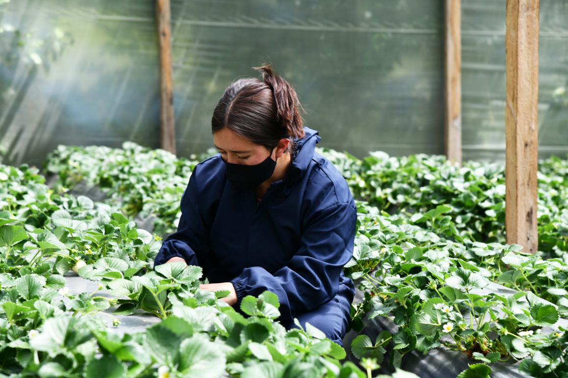 Los integrantes de la Asociación Forjadores de paz tabajan en los 3 invernaderos de fresa, y logran sacar un promedio de 50 kilos de fresa a la semana. Foto por: Nadya González, UNVMC.