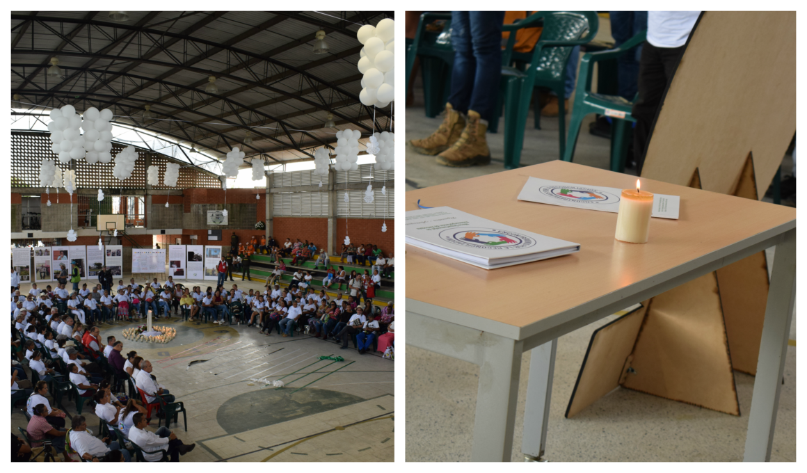 Desde el Espacio Territorial de Capacitación y Reincorporación -ETCR- de Carrizal, a cuatro horas de la cabecera municipal, llegaron los excombatientes de Farc, junto con Pastor Alape. Mientras que acompañados por la Ong Semillas de Esperanza, vinieron representantes de las desmovilizadas AUC. En el corazón del coliseo estaban las víctimas.