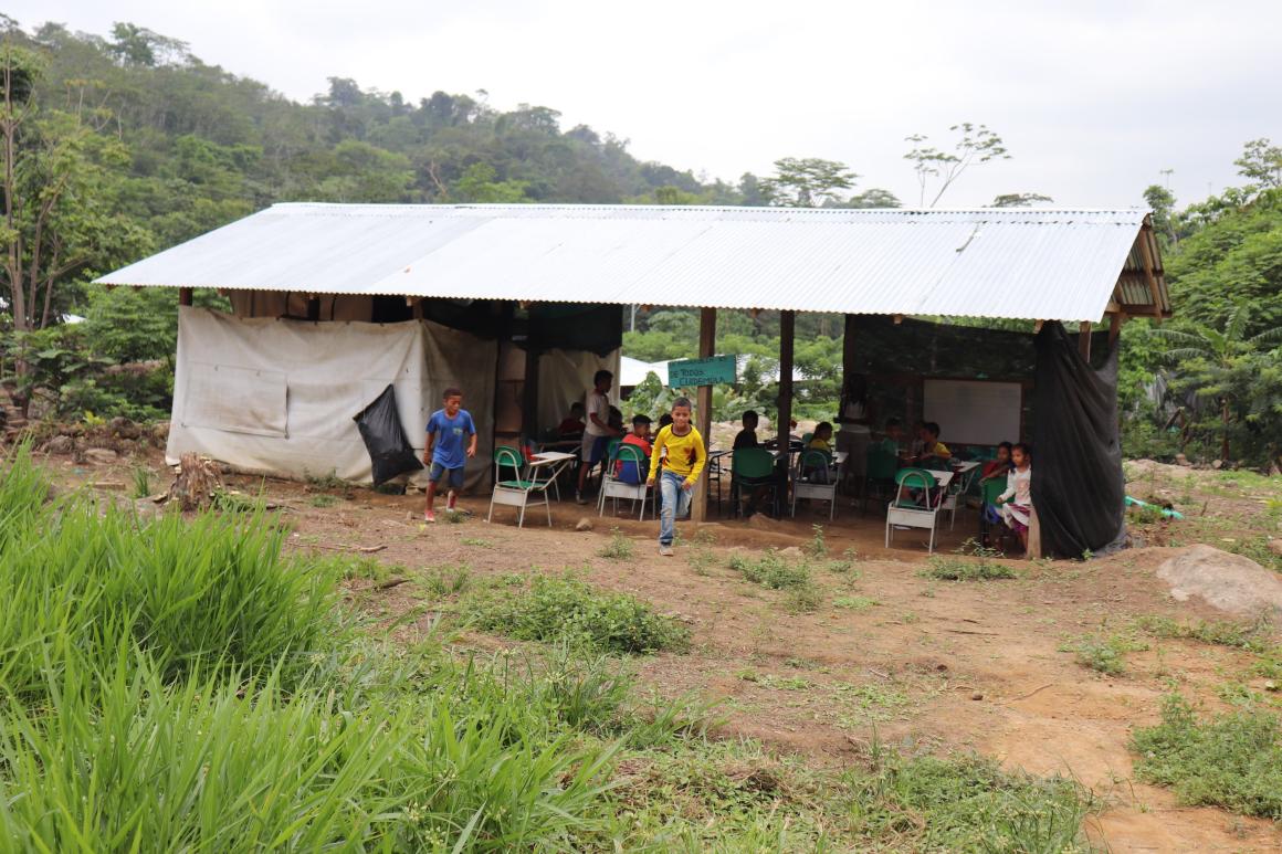 La docente Mery Laura Guidos Ríos se seca la frente mientras escribe en el tablero, espanta los bichos y se limpia el polvo. Los niños y niñas tratan de concentrarse en medio de la humedad y del calor. Así es la escuela en la que tienen sus clases 23 niños y niñas de primaria, con edades entre 5 y 15 años. Es una estructura tipo kiosco, con techo de zinc y una estructura de madera, sin paredes ni piso. Hay pupitres y mucho deseo de aprender.