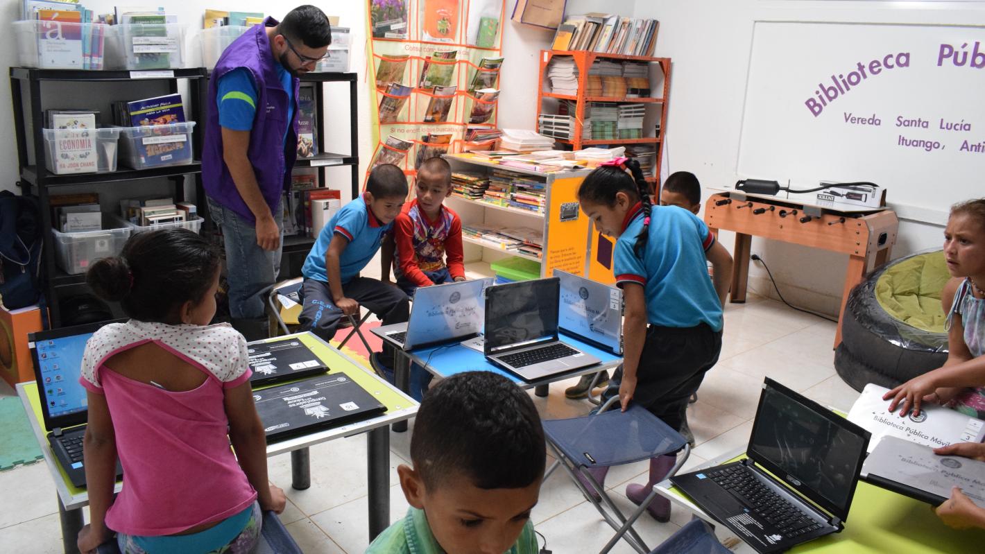 Desde muy temprano, los niños y niñas tocan la puerta de la biblioteca y piden las tabletas, los computadores, juegos didácticos y, por supuestos, cartillas y libros -muchos libros- en especial “La reina de los colores” de Jutta Bauer. “Es quizá el que más les gusta, lo piden mucho”, relata Esteban mientras ordena los elementos de este espacio lúdico, ubicado al lado de la institución educativa de esta vereda del norte antioqueño.