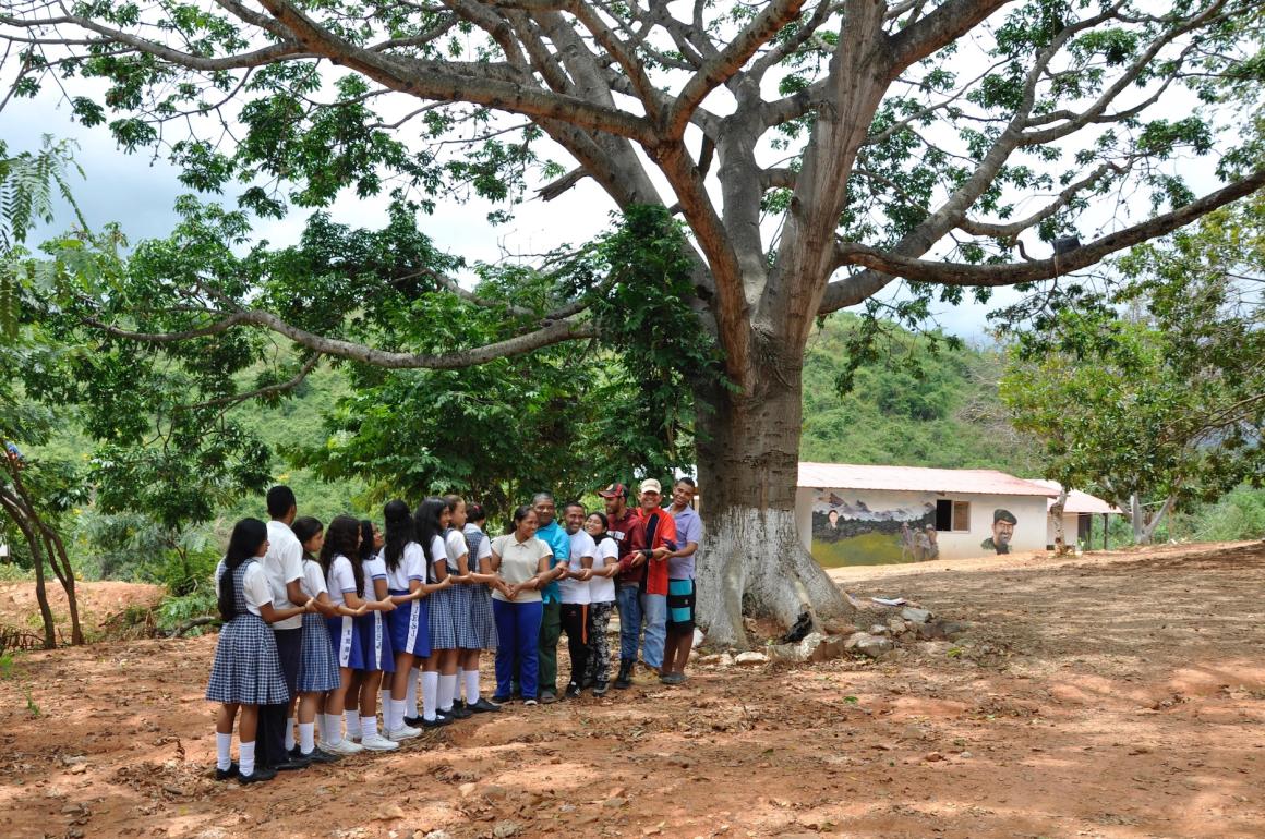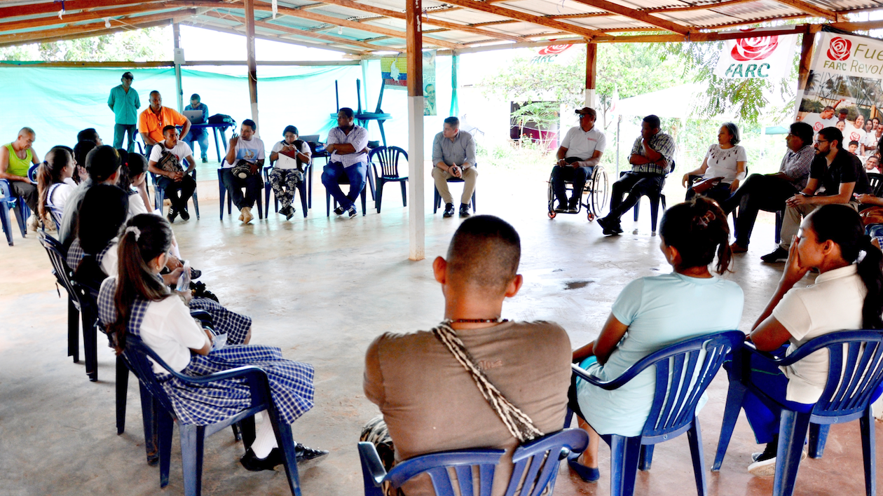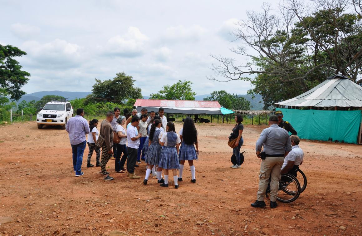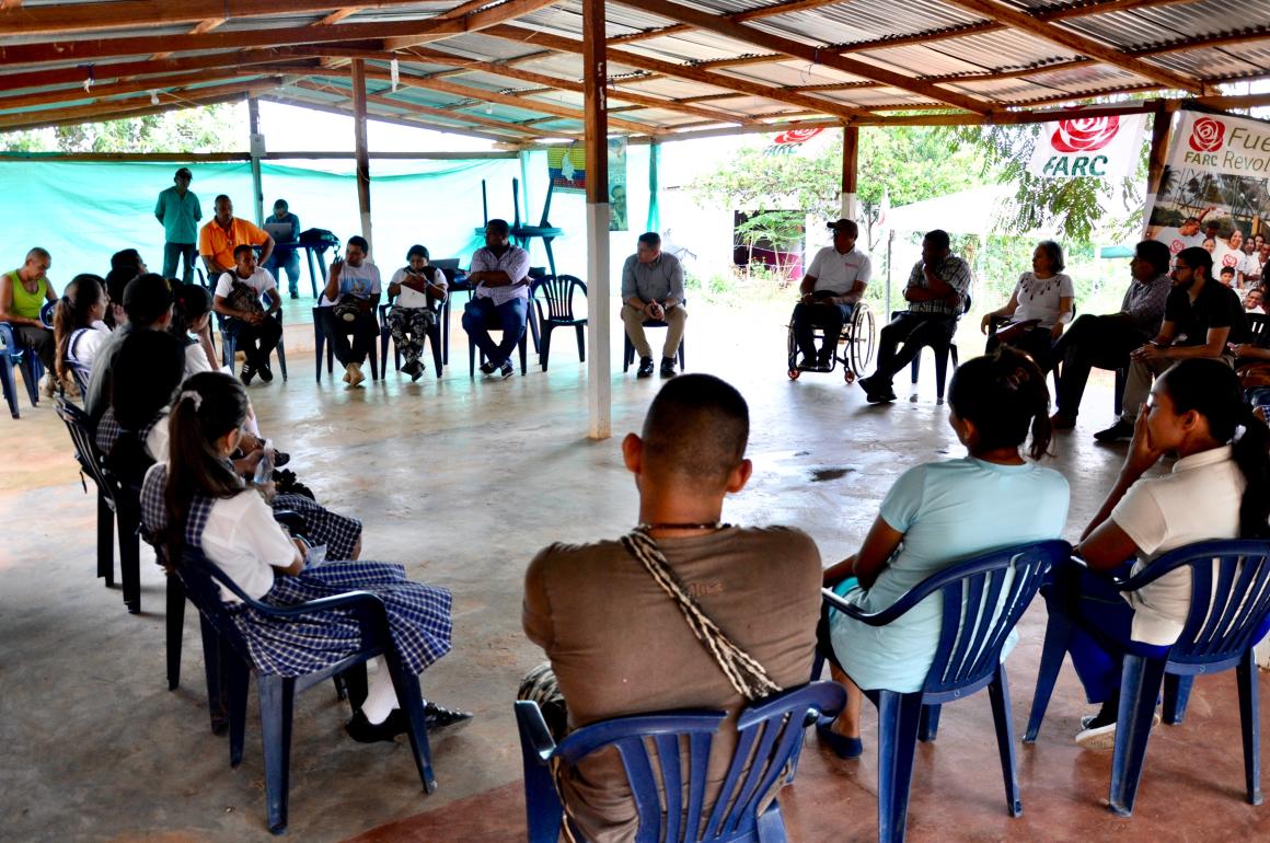 Los niños iban acompañados por Laguna, su profesor de matemáticas; el rector de la Institución Educativa, Wilmer Galindo Ospino; la orientadora escolar, Loyda Rodríguez y el coordinador de convivencia Humberto Restrepo; dos miembros de la Policía Nacional, y varios funcionarios de la Agencia para la Reintegración y Normalización, ARN. Arriba, tras superar la loma, en el ETCR, había varios funcionarios de la Misión de la ONU apoyando la llegada de los estudiantes al lugar. Dos policías más patrullaban el ETCR. Una tienda y un restaurante estaban abiertos con algunos clientes y en la parte más alta un salón social, hecho de madera y tejas de zinc, estaba listo para albergar a los estudiantes quienes entregarían sus cartas a Farc.