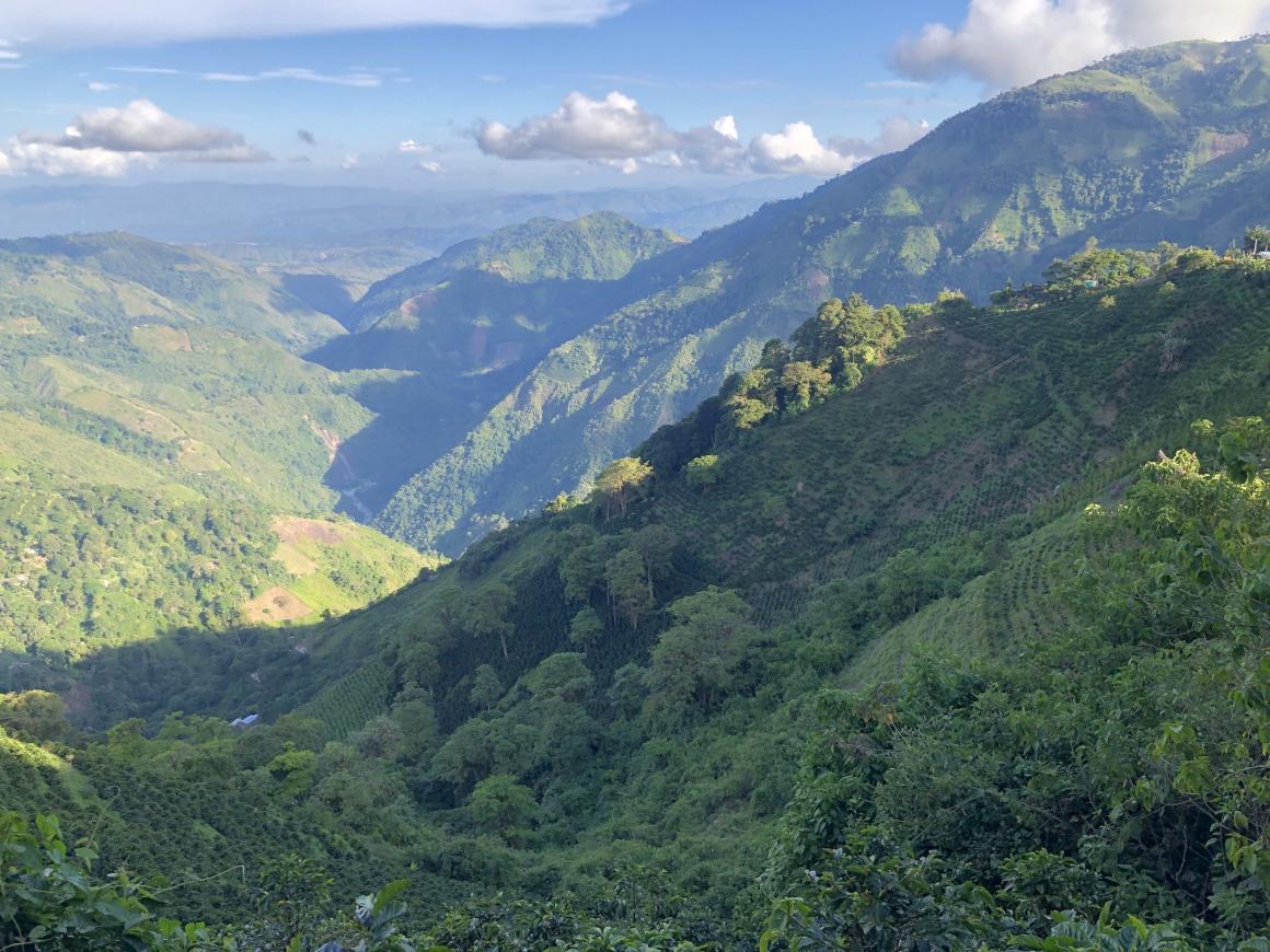 Sembrados de café se mezclan con árboles nativos en el sur del departamento de Tolima, en el paisaje del Cañón de las Hermosas. Foto por: Héctor Latorre/UNVMC