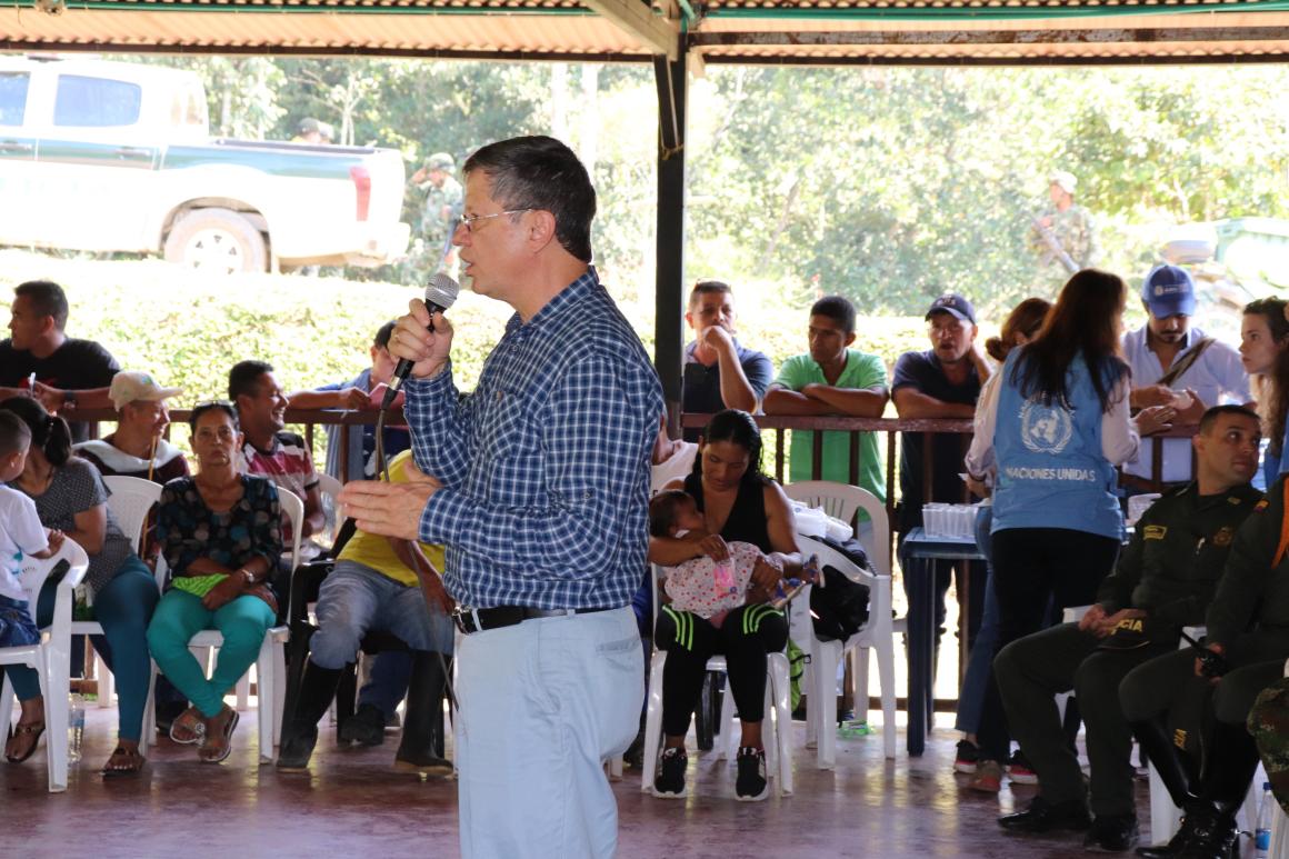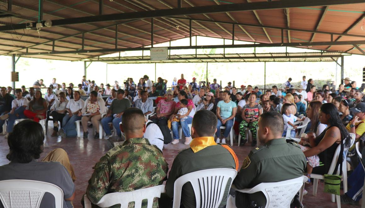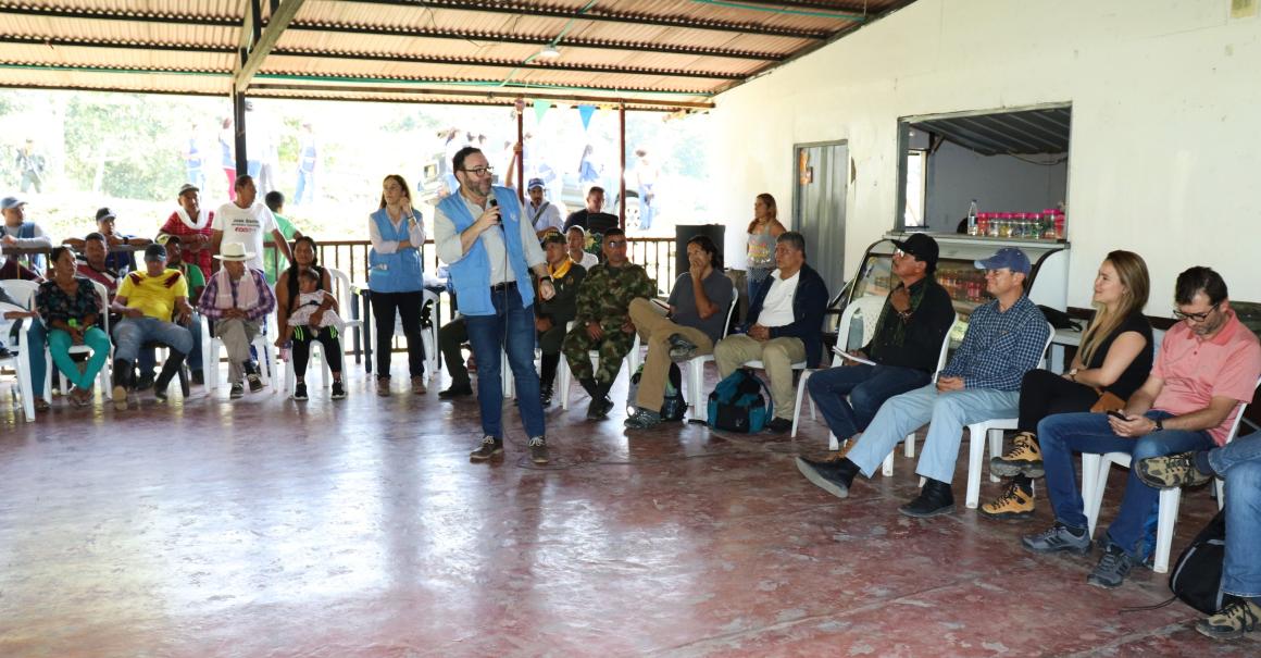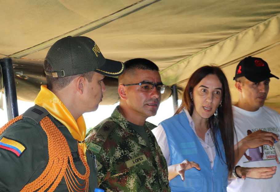 La visita que se realizó el martes 11 de febrero, inició con un diálogo con las Fuerzas Militares y de Policía y posteriormente con la Carpa Azul, donde confluyen la comunidad, las personas en proceso de reincorporación, Gobierno y la Fuerza Pública.