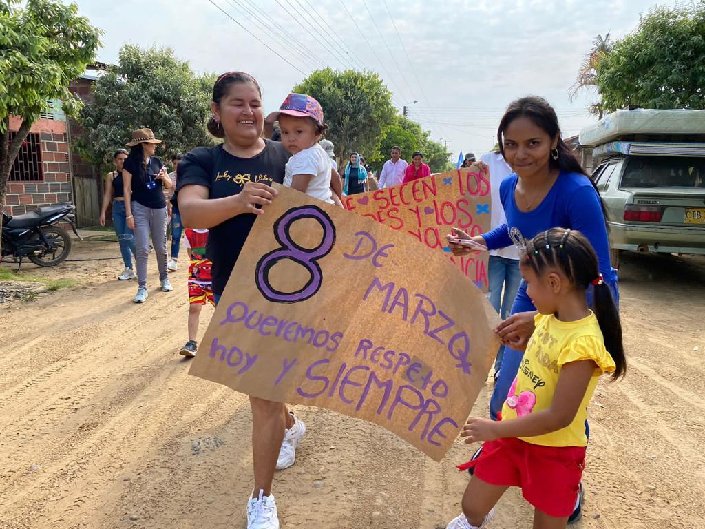En Villa Paz se conmemoró el Día Internacional de la Mujer, con una marcha que salió del pequeño caserío del corregimiento, avanzó por los polvorientos caminos que conducen al antiguo ETCR y terminó en la zona común donde, al menos, unas 200 personas y sus hijos e hijas disfrutaron de una jornada de actos culturales.