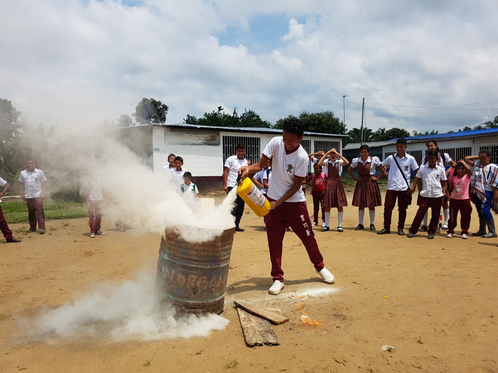 El esfuerzo del equipo de la Misión de Verificación ha permitido dotar a la escuela de extintores que han sido utilizados en los talleres como simulacros de emergencia.