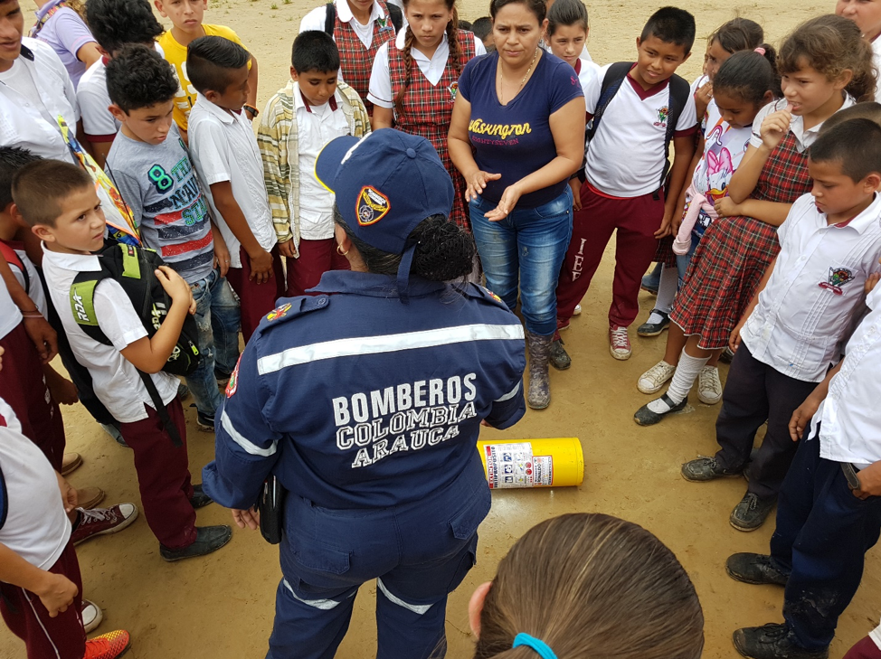 Gracias a la coordinación de la Misión de Verificación se logró que el equipo de bomberos de Arauca llegara a la vereda Filipinas para instruir a los niños sobre la importancia de la prevención como herramienta de protección.