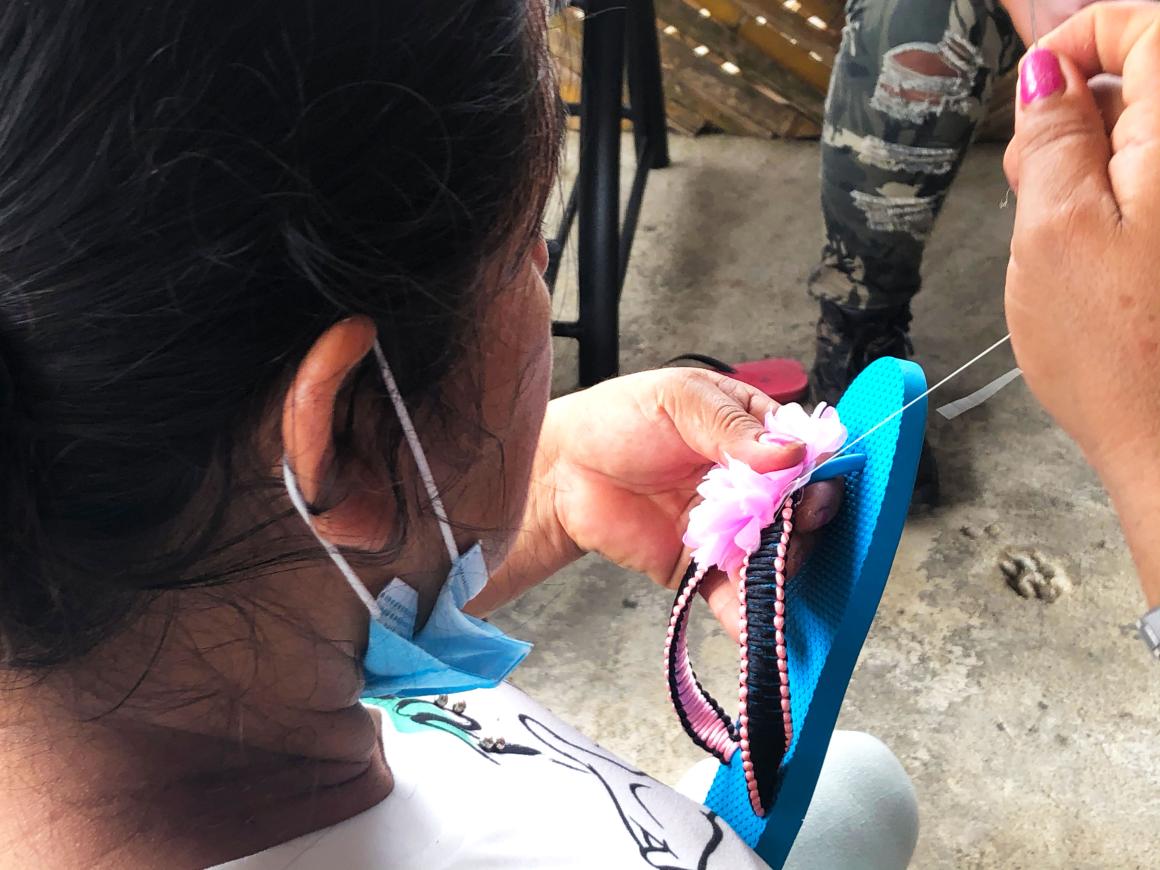 Paralelamente, con el acompañamiento de una observadora de la Misión de Verificación de la ONU y algunos apoyos adicionales de otras organizaciones en el territorio, aprendieron el arte del tejido de sandalias y otros accesorios. Con paciencia fueron tejiendo poco a poco sus sueños de tener un emprendimiento que les brindara independencia económica.