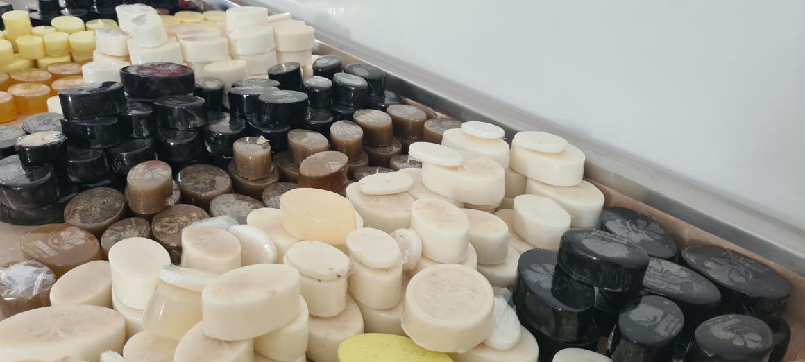 Hay jabones -de varios colores, formas y aromas-, pomadas y aceites con distintos ingredientes naturales, como la miel, cultivados en huertas caseras y en un vivero ubicado en el mismo espacio. “Este es de caléndula, muy buena para los dolores, desinflamar”, explica Luz Omaira mientras hace un recorrido por el lugar.