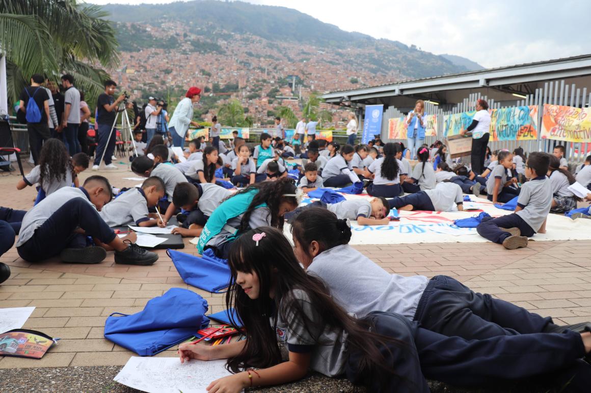 Los niños, niñas y adolescentes de la Institución Educativa Presbítero Antonio José Bernal Londoño, en el norte de Medellín, fueron los encargados de pintar de muchos colores sus anhelos de paz. Con motivo de la conmemoración del Día Internacional de la Paz que se celebra el 21 de septiembre, se juntaron en el aula abierta del colegio para llenar de colores el mapa de Colombia y enviar un mensaje de reconciliación.