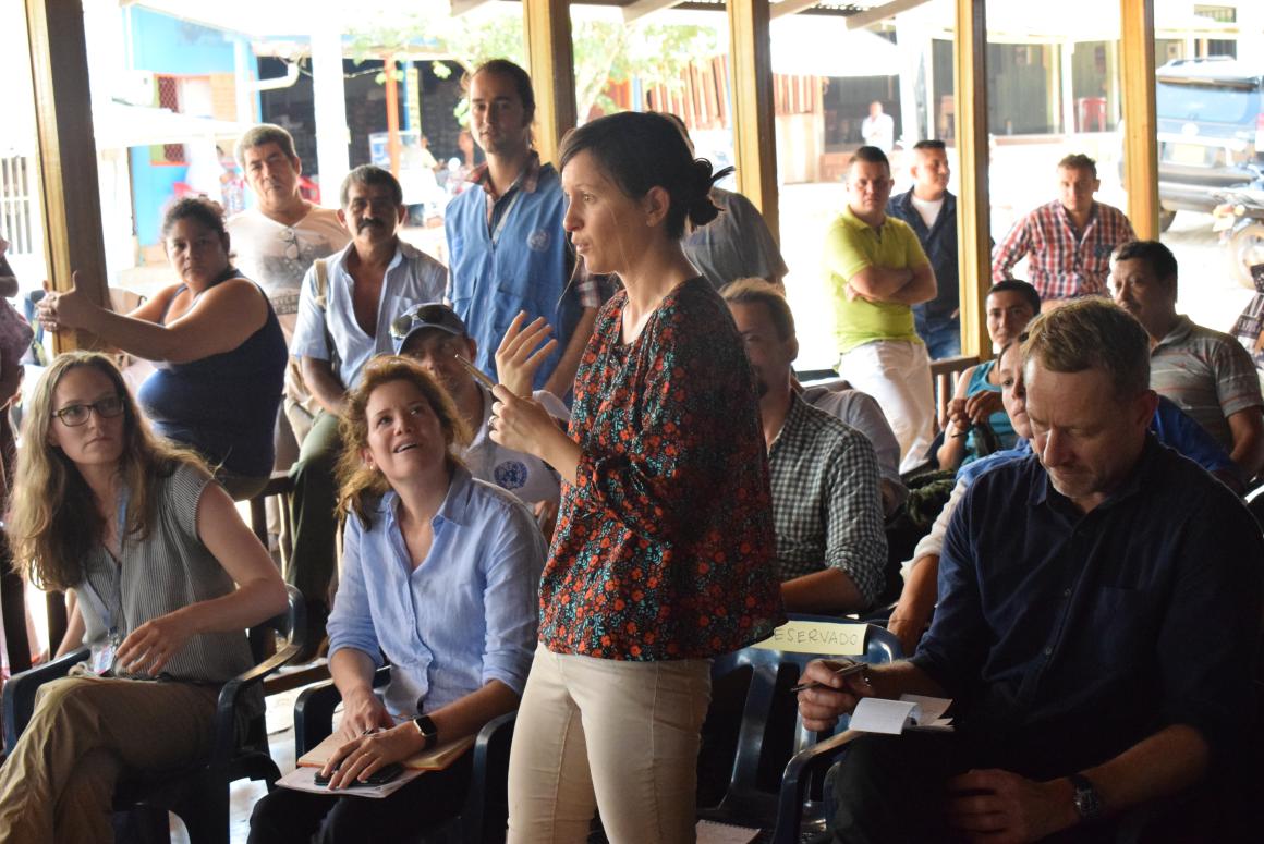 Posteriormente, en el ETCR ubicado en La Cooperativa, los delegados de los distintos países pudieron compartir con Jairo González Mora (“Bayron Yepes”), Desiderio Aguilar (“Ernesto Aguilar”), y Sandra Morelia (“Carolina”), líderes y coordinadores del espacio territorial y de algunas de las iniciativas productivas que allí se desarrollan. González presentó a los visitantes tanto las preocupaciones como los avances que han logrado, particularmente con un cultivo de sacha inchi y uno de caña, así como con un plan para emprender un proyecto turístico.