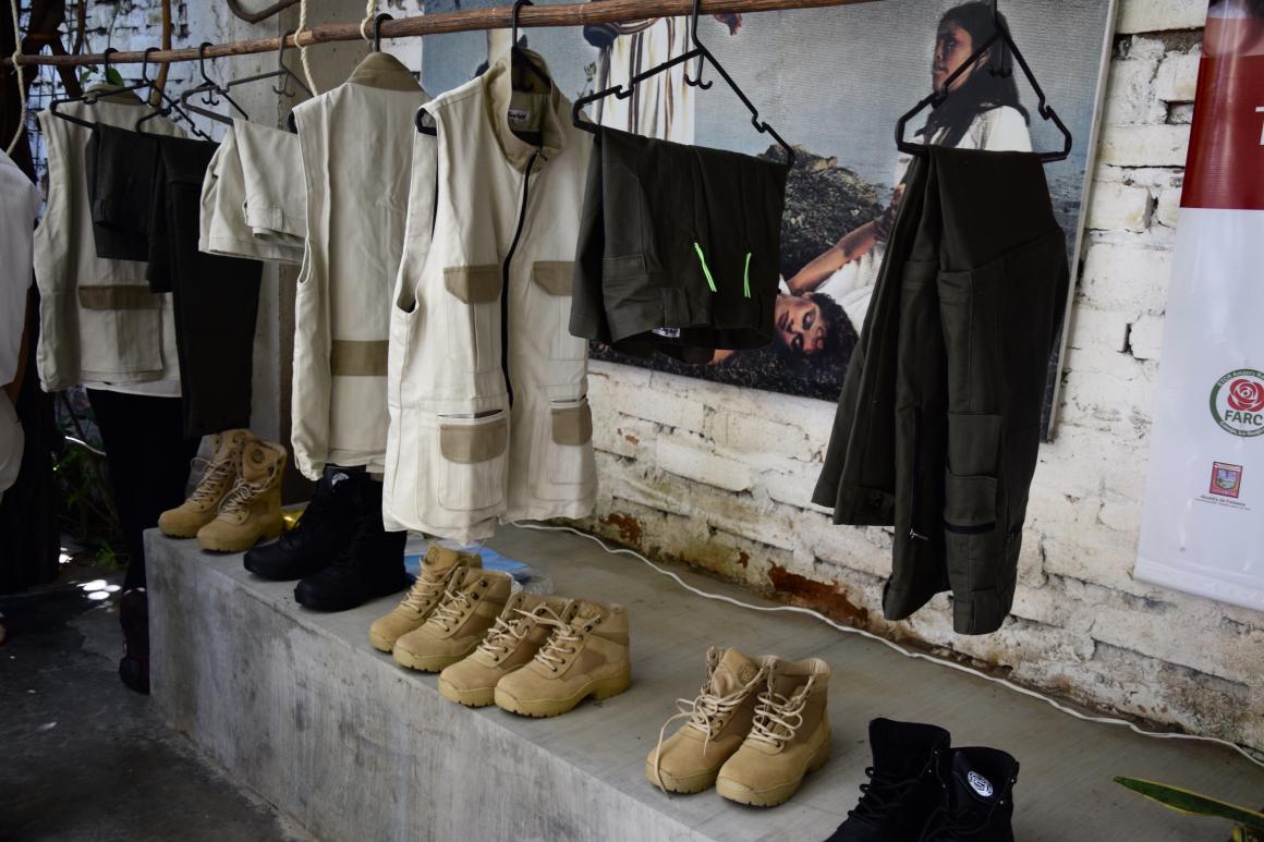 Tierra Grata, territorio de paz es la marca con la que comercializan los productos realizados en la sastrería de este antiguo ETCR del Cesar, hoy una vereda del municipio de Manaure, Cesar. Allá tienen un pequeño taller con seis máquinas de coser de las que usaban en la selva y con las que confeccionaban uniformes militares. Hoy con estas mismas máquinas fabrican prendas muy básicas que venden a visitantes y en pueblos vecinos. Aunque hasta ahora no tienen contratos estables, esperan conseguir los recursos para comprar las máquinas que requieren para completar su taller y apostarle así a confeccionar ropa para el aire libre, como la que lanzarán este 30 de octubre.