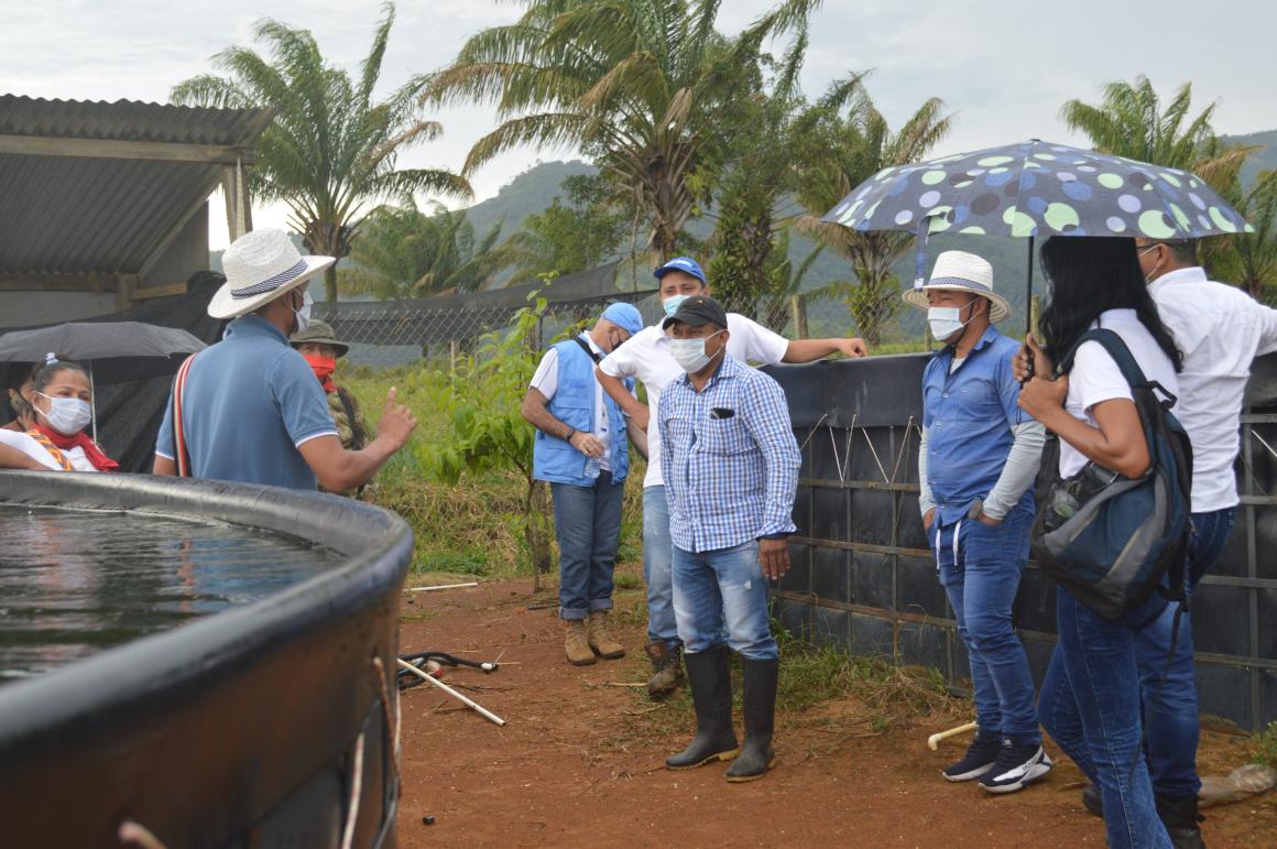 Ya en Agua Bonita, los visitantes de la Granja de Paz hicieron un recorrido por las piscinas de piscicultura del AETCR y los demás proyectos productivos: ganadería, cultivo de piña, porcicultura;, donde pudieron conocer las tecnologías que allí se han implementado y que les servirán para su propia iniciativa. Así mismo, dialogaron sobre la inclusión de la economía del cuidado y el enfoque de género en dichos proyectos. Las mujeres visitantes de la Granja de Paz también facilitaron un taller sobre la construcción de la política pública de género en Puerto Guzmán y su experiencia con las autoridades locales.