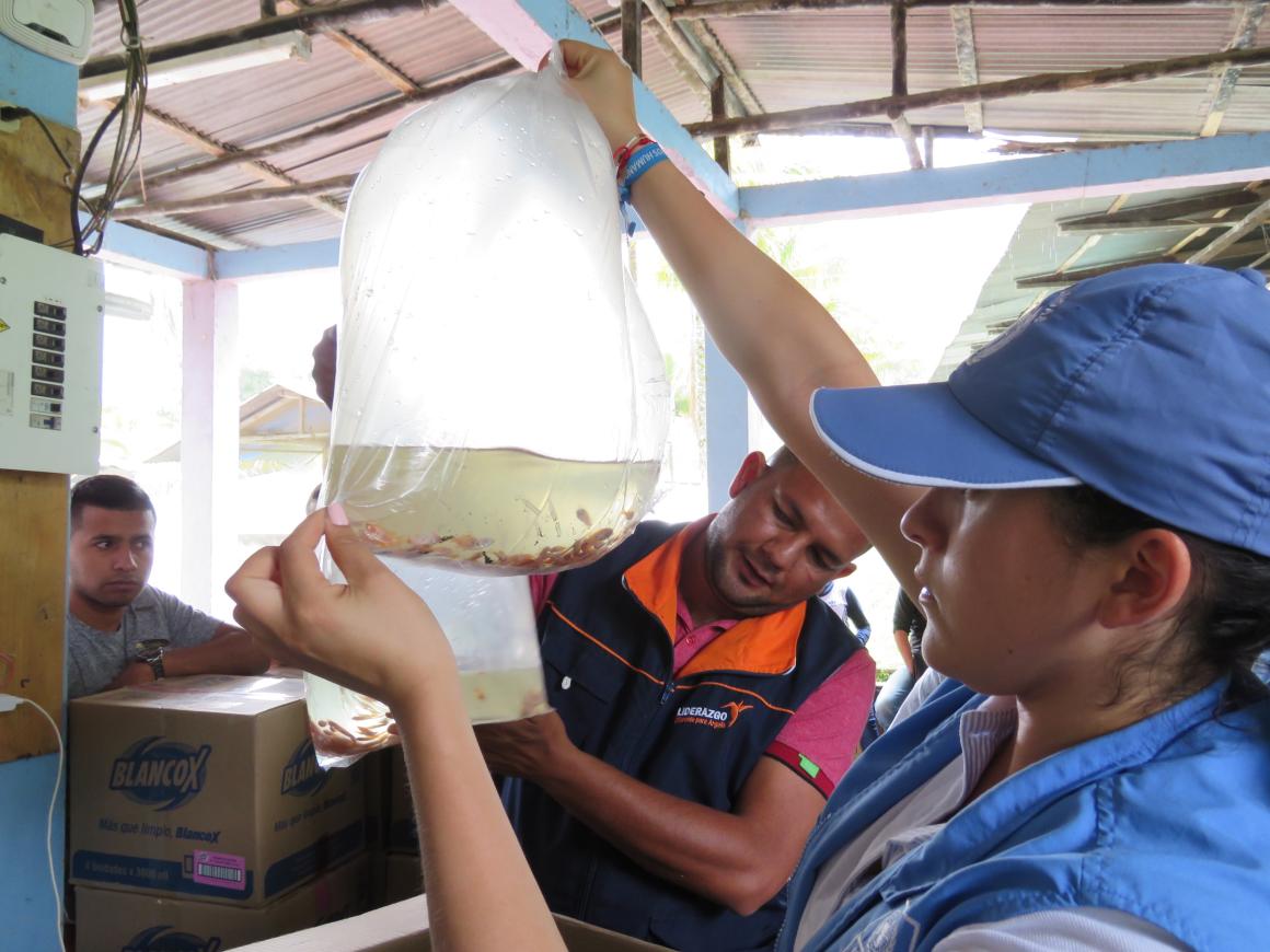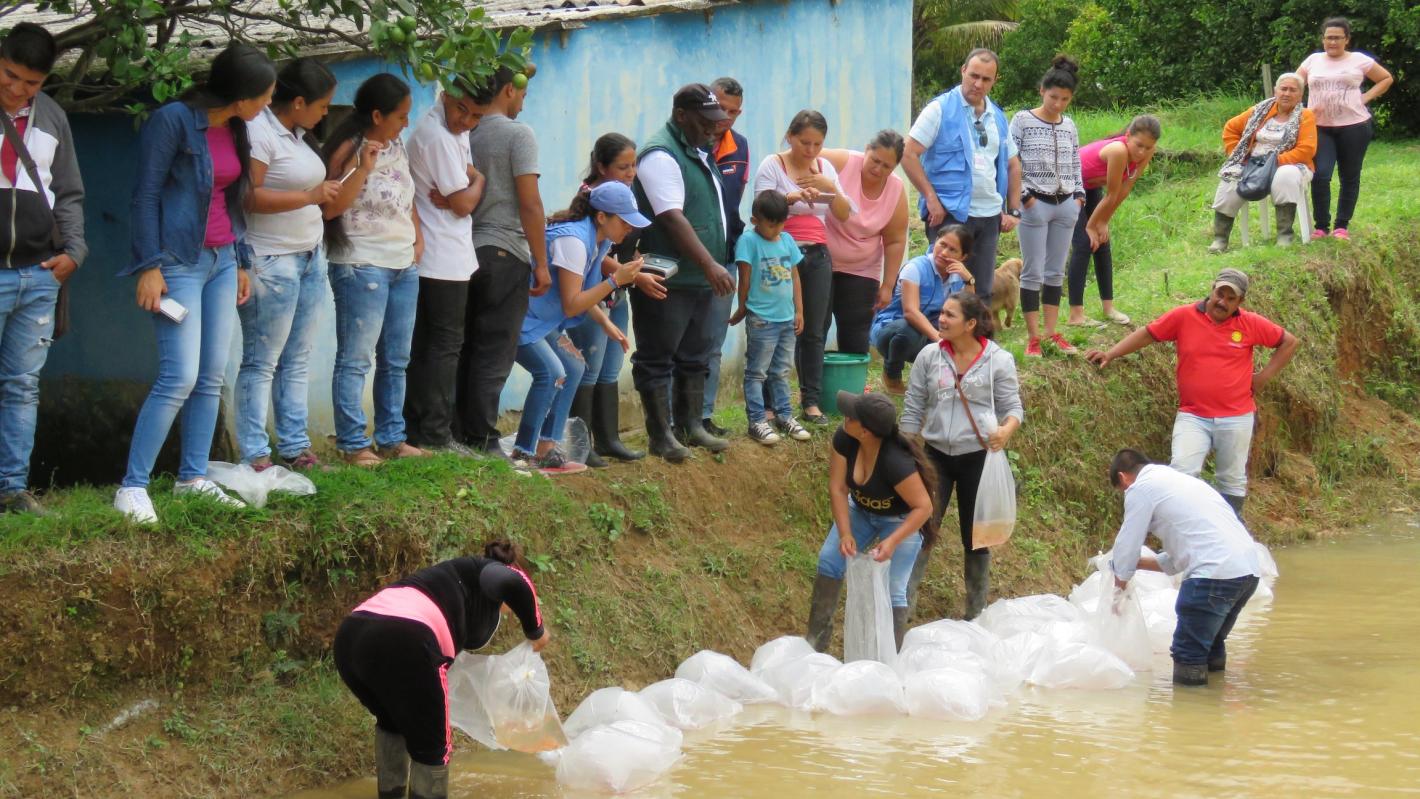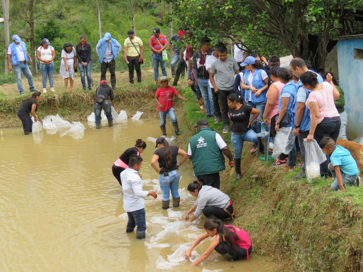 ¡Ya van llegando los alevinos!, exclamó Flor Quiñónez, vicepresidenta de la Asociación de Mujeres Campesinas de Argelia (AMAR) al terminar una llamada telefónica. Después de esa frase, todo fue emoción: los integrantes de la Cooperativa de excombatientes de Farc y las mujeres de AMAR, en compañía de los oficiales de la Misión de Verificación de la ONU, PNUD y SENA observaron a lo lejos una camioneta blanca.