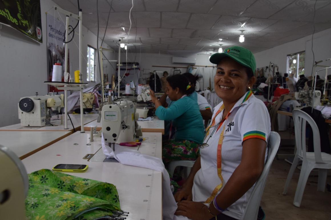 Donde están las mujeres todo es distinto, y no solo por el clima, generado por dos aires acondicionados y por una ceiba gigante que cubre el lugar del sol, sino porque aquí, excombatientes de Farc, familiares de exguerrilleras y de la comunidad, trabajan juntas en una fábrica de textiles que promete convertirse en su nuevo medio de vida.