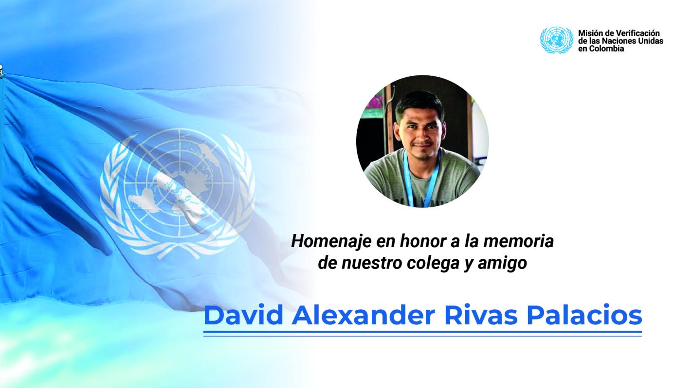 David Alexander Rivas Palacios se incorporó a la Misión de Verificación de las Naciones Unidas en Colombia como observador internacional en abril del 2022. David cumplía funciones de verificación de la implementación del Acuerdo Final de Paz en el departamento del Huila, en el área de garantías de seguridad para excombatientes, sus familias y las comunidades. Sus compañeros y amigos recuerdan a David como una persona responsable, comprometida, dedicada a su trabajo y a su familia, quien siempre desempeñó sus labores con gran profesionalismo. Sus colegas y todo el personal de la Misión le rinden tributo por su servicio en la consolidación de la paz en Colombia.