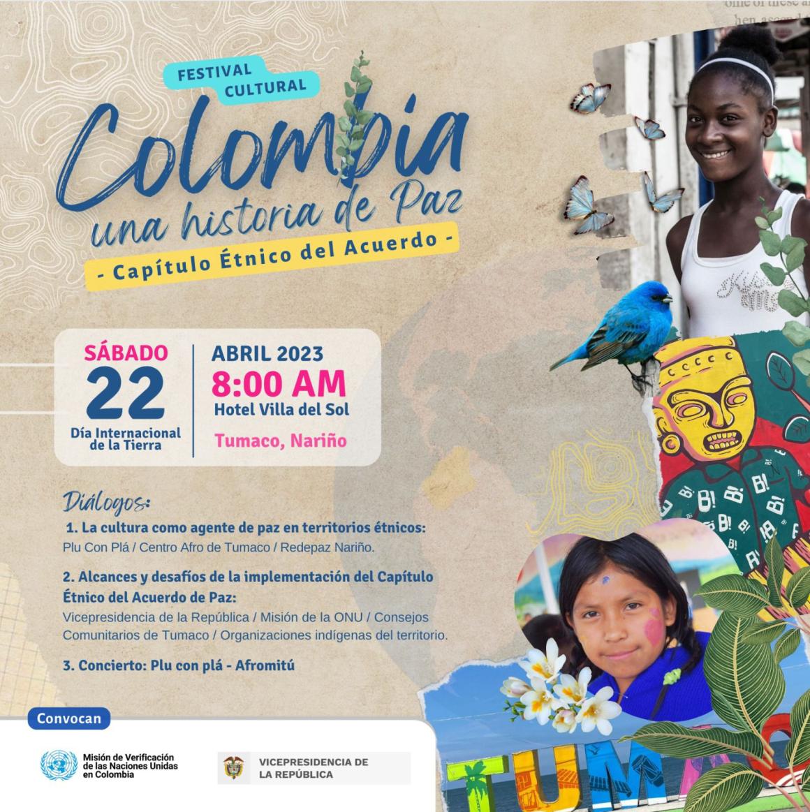 Tumaco, Nariño, 18 de abril de 2023. En el marco del Día Internacional de la Madre Tierra, se llevará a cabo este 22 de abril, en el hotel Villa del Sol, de Tumaco, Nariño, el evento ‘Colombia una historia de paz, capítulo étnico del Acuerdo’, el cual busca reflexionar de manera conjunta a preguntas como: ¿Qué es el Capítulo Étnico del Acuerdo de Paz y por qué es importante para las comunidades de Tumaco y el pacífico nariñense?