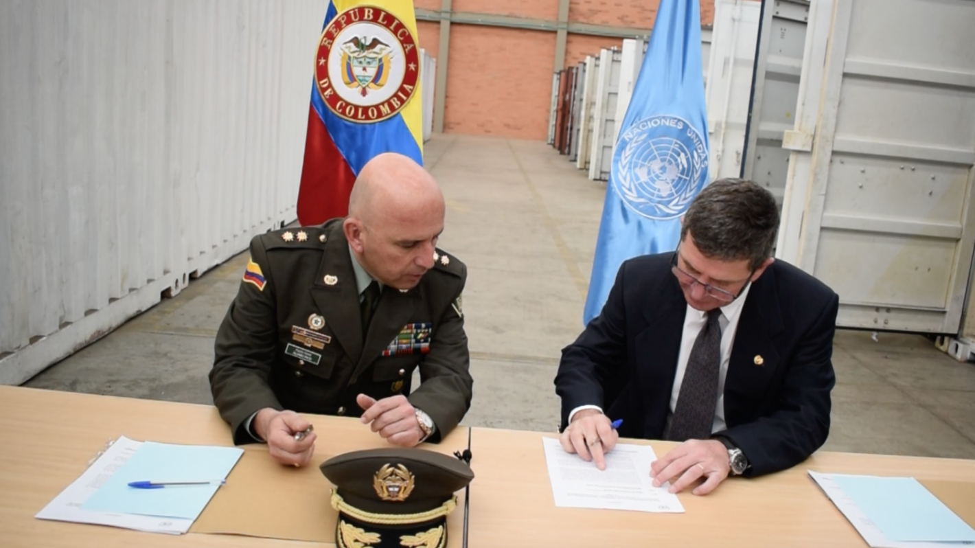 Bogotá 13 de Octubre de 2107.- La Misión de Verificación de las Naciones Unidas en Colombia informa que el día de hoy hizo entrega formal al Gobierno Nacional, bajo custodia y garantía de seguridad de la Unidad de Policía Especial para la Paz (UNIPEP), de 69.034 kilogramos de material resultado de la inhabilitación y destrucción de todo el armamento y munición de las FARC-EP que hasta el momento se encontraba resguardado en el Depósito General de Armamento de la Misión.