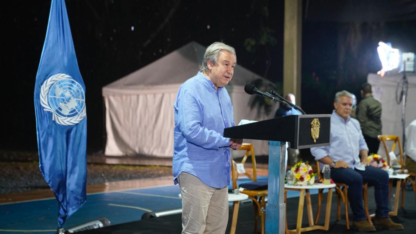 Empezar mi sexta visita a Colombia, segunda como Secretario General, aquí, en Antioquia, tiene un significado especial. Es para mí un honor estar con vosotros acompañado por el señor Presidente Duque con quien tantas veces discutí los progresos y los retos de la implementación del Acuerdo de Paz y cuya determinación merece toda mi solidaridad y apoyo.